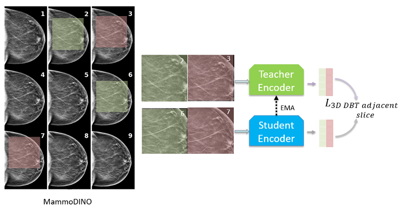 Concretely, we sample nearby slices from the same DBT volume, apply conservative tissue-aware transforms, and train the student representation for one slice to align with the teacher representation of its neighbor. This encourages features that remain stable across depth, reflecting the smooth anatomical transitions in DBT.